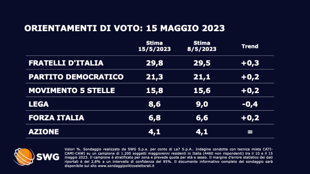 Sondaggio realizzato da SWG s.p.a. per conto di La7 s.p.a., condotta con tecnica mista CATI-CAMI-CAWI su un campione di 1200 soggetti maggiorenni residenti in Italia (4583 non rispondenti) tra l’3 e l’8 maggio 2023. Il campione è stratificato per zona e prevede quote per età e sesso. Il margine d’errore statistico dei dati riportati è del 2,8% a un intervallo di confidenza del 95%.