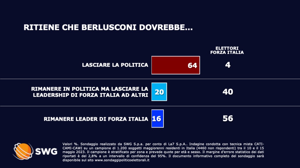 L’altra domanda riguarda il destino di Forza Italia qualora l’ex premier dovesse decidere di lasciare la politica. Per il 36% il partito potrebbe trovare un nuovo leader e rilanciarsi, per il 38% difficilmente gli Azzurri troverebbero un nuovo leader e diventerebbero più deboli, per il 26% la formazione non avrebbe più ragione di esistere, si dissolverebbe. La maggior parte degli intervistati legano dunque il destino del partito a quello del suo leader. Gli elettori del partito tuttavia al 48% confidano nella possibilità di trovare un nuovo leader e nel rilancio. A beneficiare della scomparsa di Forza Italia, secondo gli intervistati, sarebbe soprattutto Fratelli d’Italia: per il 30% degli intervistati gli ex Azzurri voterebbero il partito della premier Meloni, per il 10 Lega, per il 10 Azione, per l’8 Noi Moderati, per il 5 Altri Partiti. 19 gli indecisi, 18 gli astenuti.