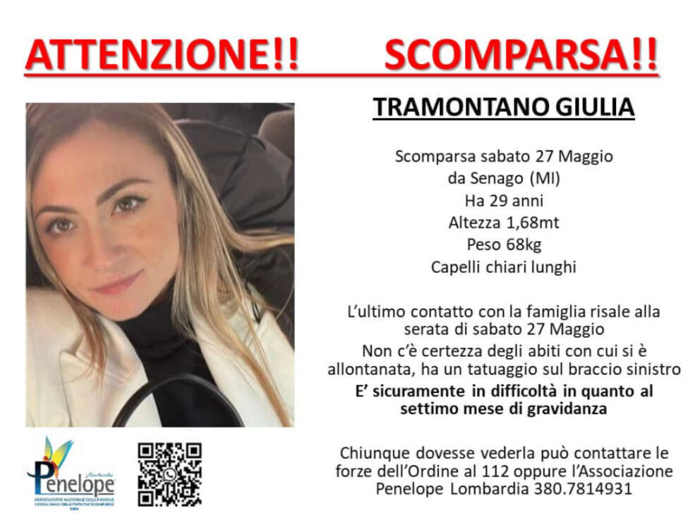 Giulia Tramontano è alta un metro e 68, ha i capelli biondi e un tatuaggio piuttosto vistoso sul braccio sinistro. Al momento non è noto come fosse vestita l’ultima volta che è uscita di casa. I parenti confermano che era serena, non aveva dato segni di insofferenza. Gli appelli per ritrovarla sono stati ripresi anche dalla trasmissione di Rai3 “Chi l’ha visto?” e dall’associazione Penelope. Quest’ultima ha diffuso una scheda con i dati e i segni particolari della ragazza e gli estremi per segnalare eventuali informazioni o avvistamenti.