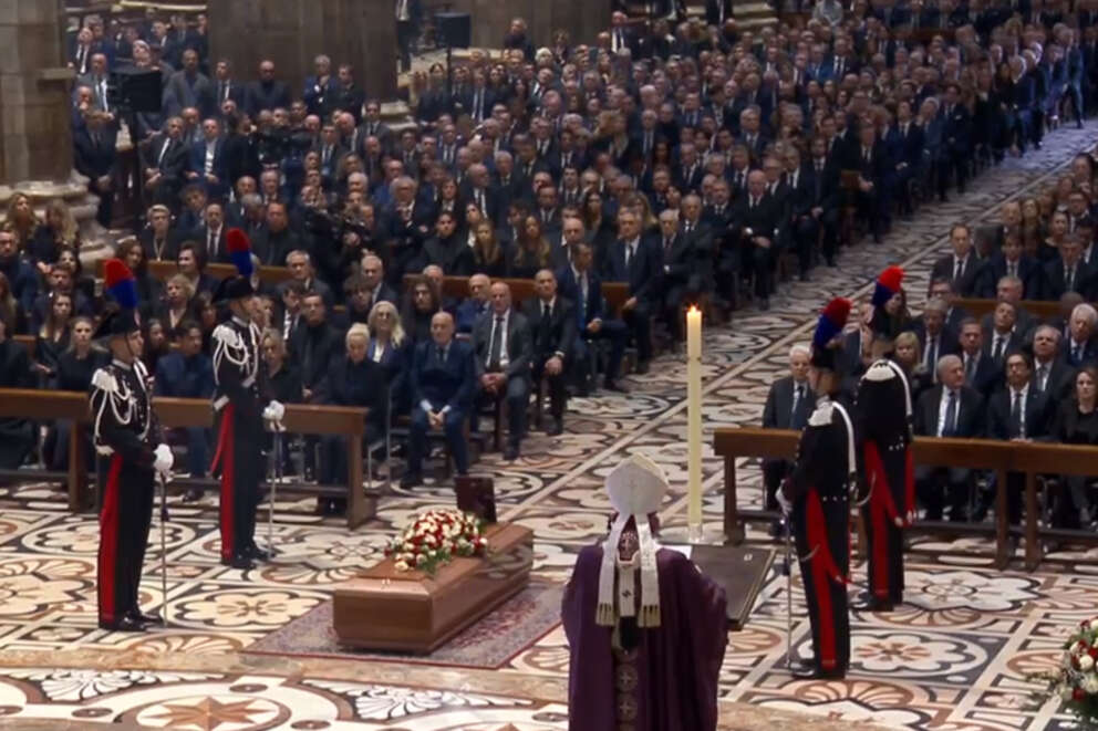 La “Madonnina”, la bara, lo chignon da Eva Kant di Marta Fascina, il labbro superiore in evidenza di Marina Berlusconi, Renzi in terza fila; Umberto Bossi, cravatta verde, su carrozzina, ai lati dell’altare maggiore; i pennacchi dei carabinieri, l’arcivescovo e i concelebranti, le bandiere del Milan in piazza. Voci: “… c’è solo un presidente, c’è solo un presidente”. Omelia: “… l’estremo saluto al fratello Silvio con pietà cristiana”. L’abito blu quasi elettrico di Piersilvio B., le bandiere di Forza Italia, la piccola croce di diamanti al collo di Marina B., l’incenso; Mattarella in prima fila. Paolo Berlusconi, fratello. Toti.