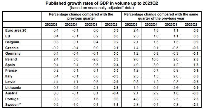 Tra gli Stati membri per i quali sono disponibili dati per il secondo trimestre del 2023, l’Irlanda (+3,3%) ha registrato l’aumento più elevato rispetto al trimestre precedente, seguita dalla Lituania (+2,8%). Peggio dell’Italia hanno invece fatto Svezia (-1,5%), Lettonia (-0,6%) e Austria (-0,4%). Su base annua, i tassi di crescita sono stati positivi per sette Paesi, con i valori più elevati osservati in Irlanda (+2,8%), Portogallo (+2,3%) e Spagna (+1,8%). L’Italia resta comunque in territorio positivo, facendo registrare +0,6% rispetto al secondo trimestre del 2022. Per la Francia il Pil su base annua si attesta allo 0,9%, mentre la Germania è in territorio negativo con -0,1%. I cali più elevati sono stati registrati in Svezia (-2,4%), Repubblica Ceca (-0,6%) e Lettonia (-0,5%).