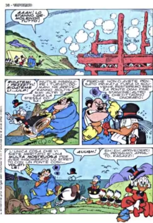 Così avrebbe scoperto che la storia del Ponte di Messina Paperon de’ Paperoni, sceneggiata da Giorgio Pezzin e disegnata da Giorgio Cavazzano, non finisce affatto bene.