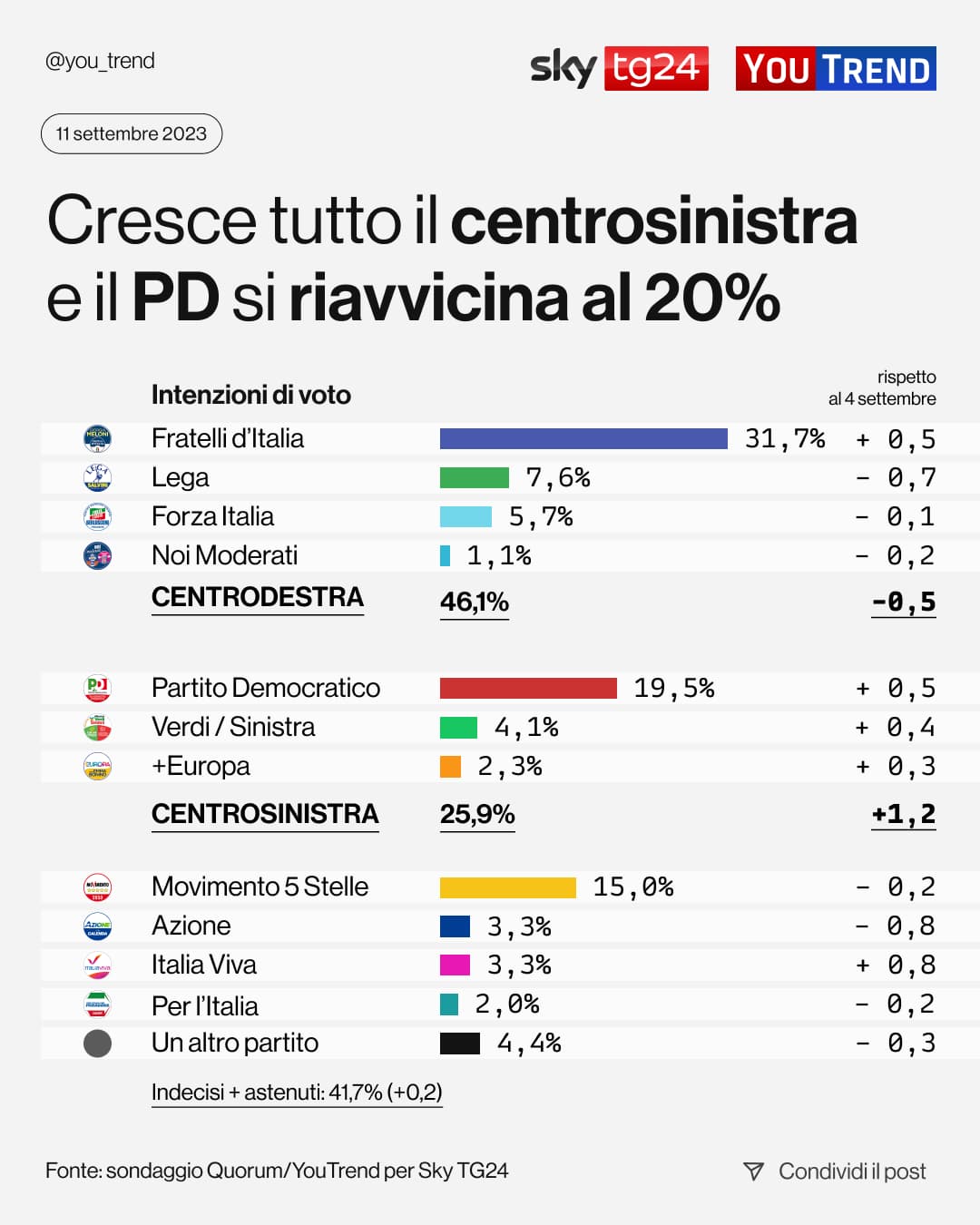 Il leader del Carroccio vede infatti la sua Lega sprofondare sotto quota 8 per cento secondo l’ultimo sondaggio Quorum/YouTrend realizzato per SkyTg24. Salvini e soci perdono lo 0,7% rispetto alla scorsa settimana, mentre al contrario Fratelli d’Italia volta al 31,7 per cento guadagnando mezzo punto percentuale. Sempre nell’ambito della destra-centro di governo, neanche la corsa a smarcarsi dalla linea sempre più estremista dei partner di governo di Forza Italia premia il partito fondato di Berlusconi: con la nuova guida di Antonio Tajani gli azzurri scivolano al 5,7% (-0,2%), mentre Noi Moderati supera di poco l’1 per cento.