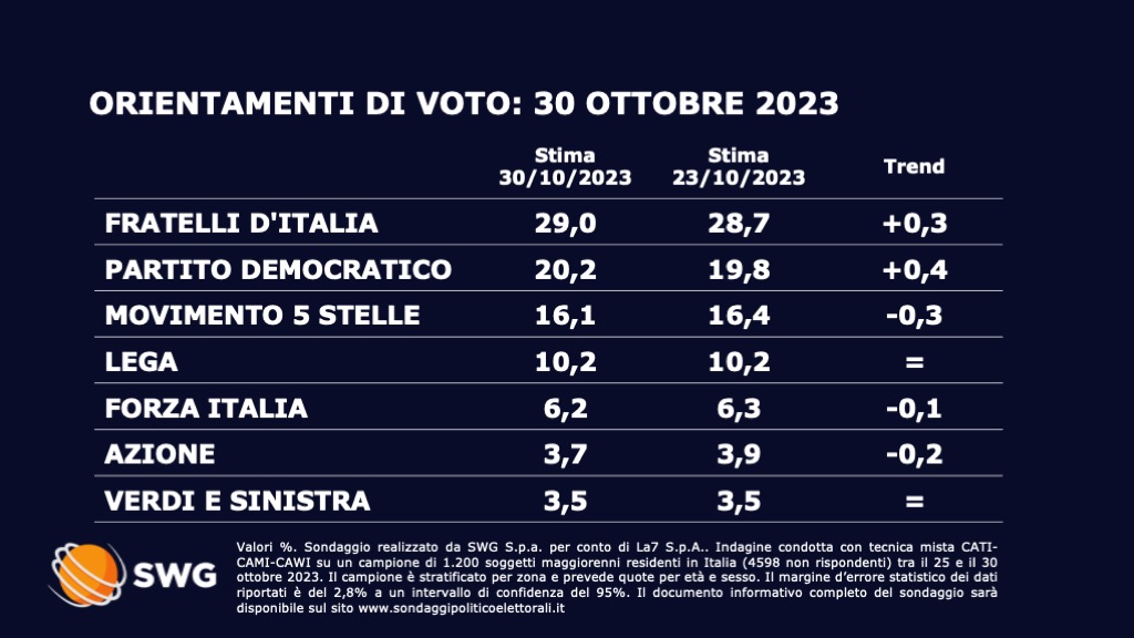 Resta grossomodo inalterato secondo l’ultimo sondaggio SWG per il TgLa7 il panorama degli orientamenti di voto degli italiani dopo una settimana dominata dalla guerra in Medio Oriente tra Israele e Hamas e nella quale via via ha preso sempre più la manovra del governo Meloni. La legge di bilancio di 109 articoli parte con il suo iter al Senato. Al centro le pensioni, gli affitti, il fisco, il Superbonus. L’Istituto dedica gran parte della sua ultima indagine proprio alle impressioni dell’opinione pubblica sulla guerra in Medio Oriente.
