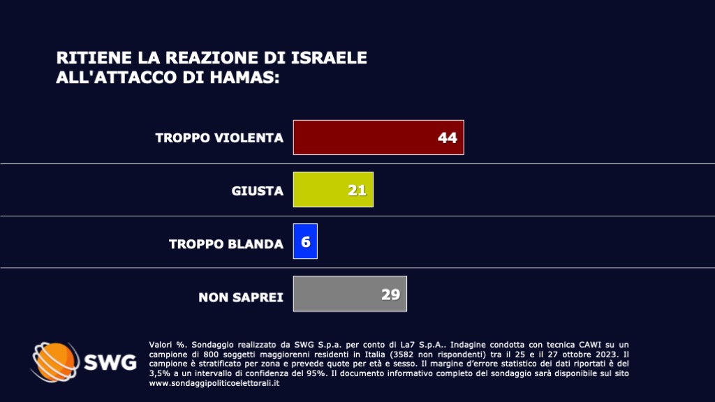 Risulta schiacciante soprattutto un dato da quello che emerge nella parte dell’indagine sulla guerra in Medio Oriente: il 44% degli intervistati ritiene che la reazione di Israele – bombardamenti che avrebbero provocato oltre ottomila morti per Hamas, dati impossibili da verificare – ai feroci e sorprendenti attacchi di Hamas di sabato 7 ottobre sia stata troppo violenta. Così come il 38% sostiene che Israele per risolvere questo conflitto dovrebbe trattare con Hamas senza attaccarlo militarmente.
