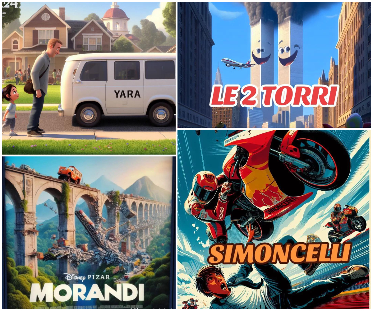 E quindi dal tono giocoso e infantile: è questo il punto. Le immagini sarebbero state create tramite Image Creator Bing. Un profilo in particolare ha inaugurato un appuntamento fisso. E si vedono immagini ispirati alla tragedia dell’attore Pietro Taricone, morto per un incidente in paracadute, a quella di Michael Schumacher, il campione di Formula 1 ridotto in gravi condizioni dopo un incidente su una pista da sci, a quella di Willy Monteiro Duarte, il 20enne ucciso di botte a Colleferro, alla strage della Costa Concordia e a quella del Ponte Morandi di Genova, a quella dell’hotel Rigopiano e a quella di Kobe Bryant, il campione di basket morto in un incidente in elicottero con la figlia Gianna.