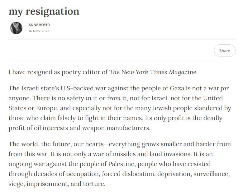 Un gesto che ha fatto scalpore, che ha fatto discutere. Anne Boyer, poetessa e saggista già vincitrice del Premio Pulitzer, ha presentato le sue dimissioni da “poetry editor” del New York Times Magazine. Una scelta dettata, come si evidenzia nella sua lettera pubblicata sul proprio Substack, una newsletter, dalla narrazione tenuta dal quotidiano sulla guerra a Gaza.