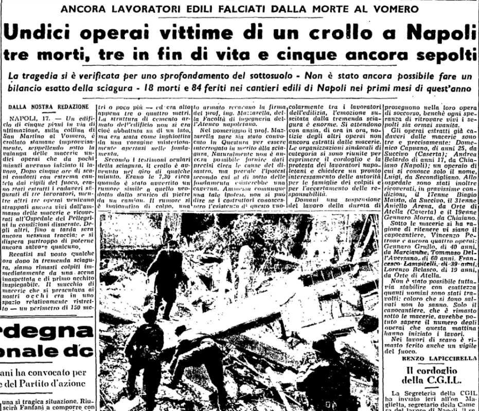 “Un edificio di cinque piani in via di ultimazione, sulla collina di San Martino al Vomero, è crollato stamane improvvisamente, seppellendo sotto la valanga delle macerie undici operai che da pochi minuti avevano iniziato il lavoro”, si leggeva nel primo resoconto sul posto dall’Unità in edicola mercoledì 18 maggio 1955. Dopo alcune ore di lavoro, di soccorsi dei vigili del fuoco, erano stati estratti dalle macerie i cadaveri di tre lavoratori, altri tre venivano portati all’Ospedale Pellegrini in condizioni disperate, gli altri risultavano dispersi.