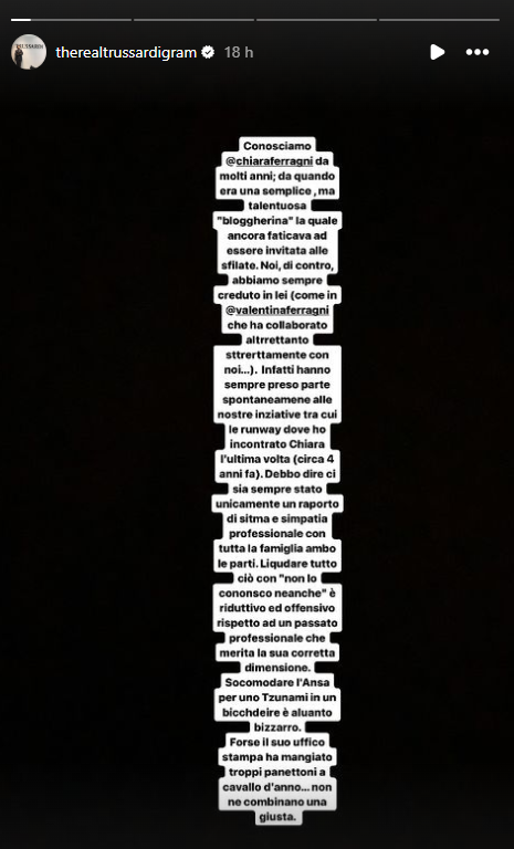 “Conosciamo Chiara Ferragni da molti anni; da quando era una semplice, ma talentuosa bloggherina la quale ancora faticava a essere invitata alle sfilate. Noi, di contro, abbiamo sempre creduto in lei (come in Valentina Ferragni che ha collaborato altrettanto strettamente con noi …). Infatti hanno sempre preso parte spontaneamente alle nostre iniziative tra cui le runway dove ho incontrato Chiara l’ultima volta (circa 4 anni fa).