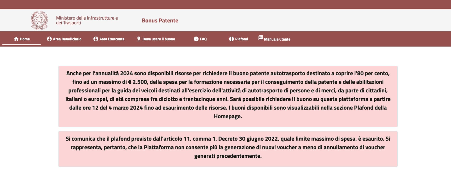 Ecco l’avviso scritto e pubblicato sul sito internet del ministero in merito al bonus: “Anche per l’annualità 2024 sono disponibili risorse per richiedere il buono patente autotrasporto destinato a coprire l’80 per cento, fino ad un massimo di € 2.500, della spesa per la formazione necessaria per il conseguimento della patente e delle abilitazioni professionali per la guida dei veicoli destinati all’esercizio dell’attività di autotrasporto di persone e di merci, da parte di cittadini, italiani o europei, di età compresa fra diciotto e trentacinque anni. Sarà possibile richiedere il buono su questa piattaforma a partire dalle ore 12 del 4 marzo 2024 fino ad esaurimento delle risorse.