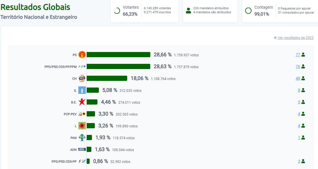 A spoglio completato, all’appello mancano solo i 4 seggi da assegnare col voto dall’estero, tra socialisti e conservatori emerge un sostanziale pareggio: il partito di Pedro Nuno Santos può contare sul 28,66% dei voti e 77 seggi, i conservatori di Alleanza Democratica sul 28,63% e 76 seggi.