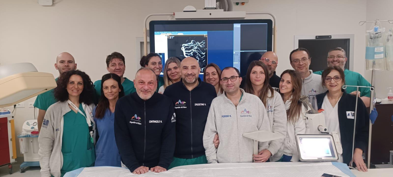 Immediata e terribile la diagnosi: ischemia in atto, causata dall’occlusione completa dell’arteria cerebrale media di destra. Chiara, seguita dal neurologo Donato Colella fin dal suo arrivo in pronto soccorso, dopo la risonanza magnetica ha mostrato un rapido e netto peggioramento dei sintomi. Considerata la progressione del quadro clinico, dopo un breve consulto, i medici hanno quindi deciso di trasferire la giovane paziente presso l’Unità Operativa Complessa di Neuroradiologia diretta dal dottor Vincenzo D’Agostino per sottoporla ad un intervento urgente di tromboectomia meccanica.
