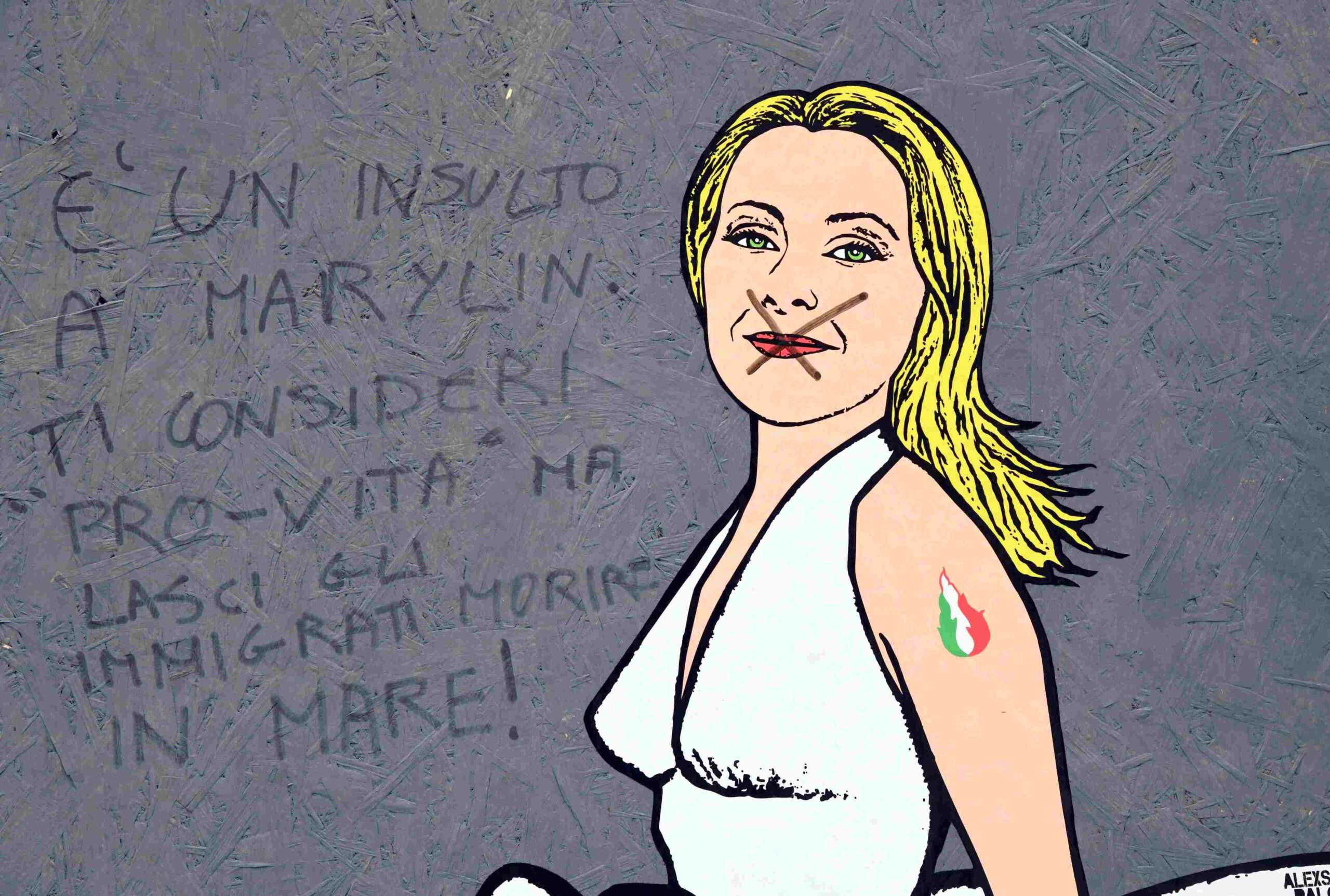 A Milano l’altro giorno è apparso un murale che ritrae Giorgia Meloni detta Giorgia in versione Marylin Monroe detta Marylin. Molto affascinante e con una fiamma tricolore missina – detta fiamma tricolore – tatuata su un braccio.