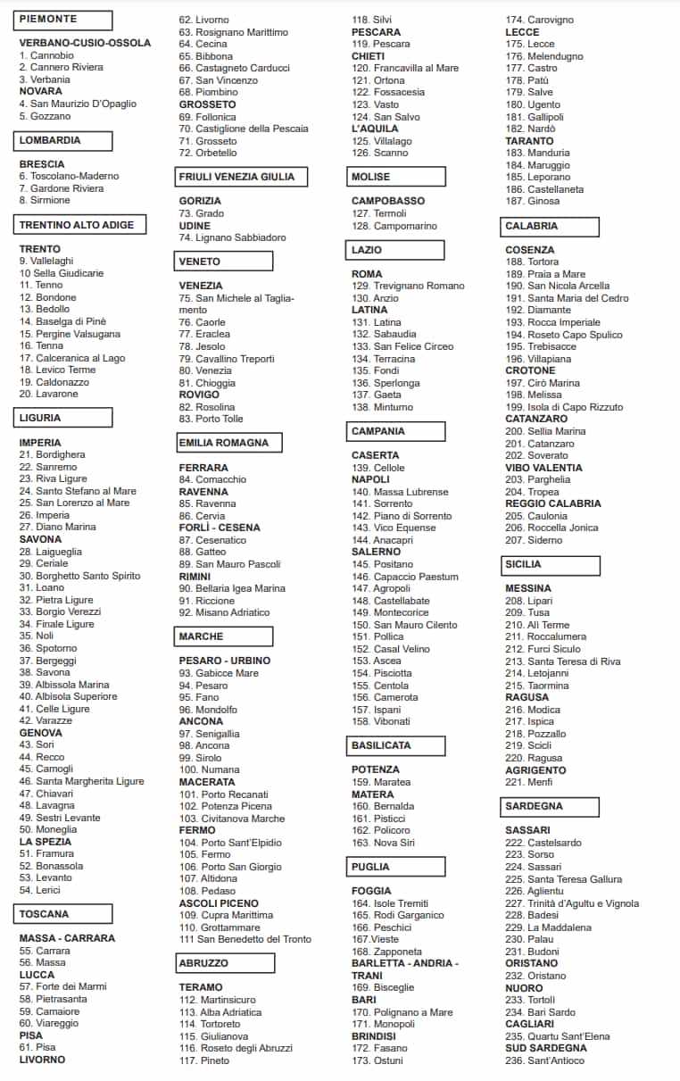 Ad entrare invece sono tre novità pugliesi (Lecce, Manduria e Patù), due liguri (Borgio Verezzi e Recco), due del Trentino (Tenno e Vallelaghi) e una a testa per Marche (Porto Sant’Elpidio), Abruzzo (Ortona), Campania (Cellole) e Calabria (Parghelia).
