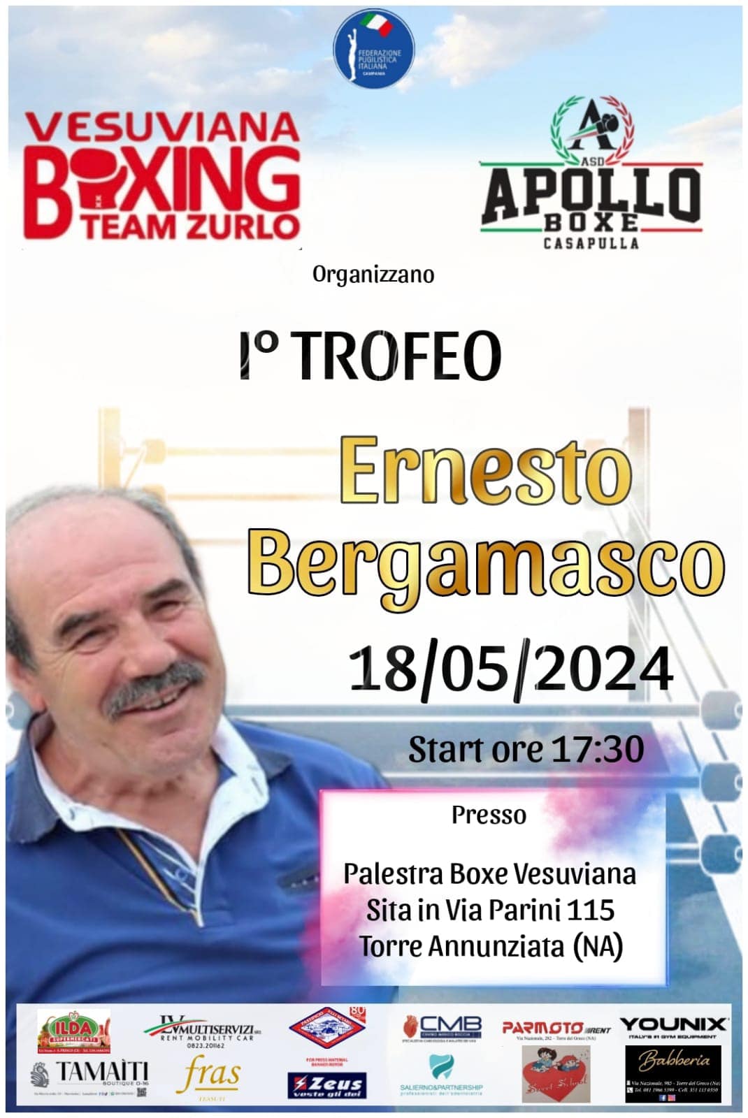 Il primo trofeo Bergamasco si terrà presso la sede della palestra Boxe Vesuviana, a via Parini 115 a Torre Annunziata, in provincia di Napoli. Start alle ore 17:30. Alla manifestazione, prima dei match ufficiali, parteciperanno anche i Giovanissimi under 13 della ASD