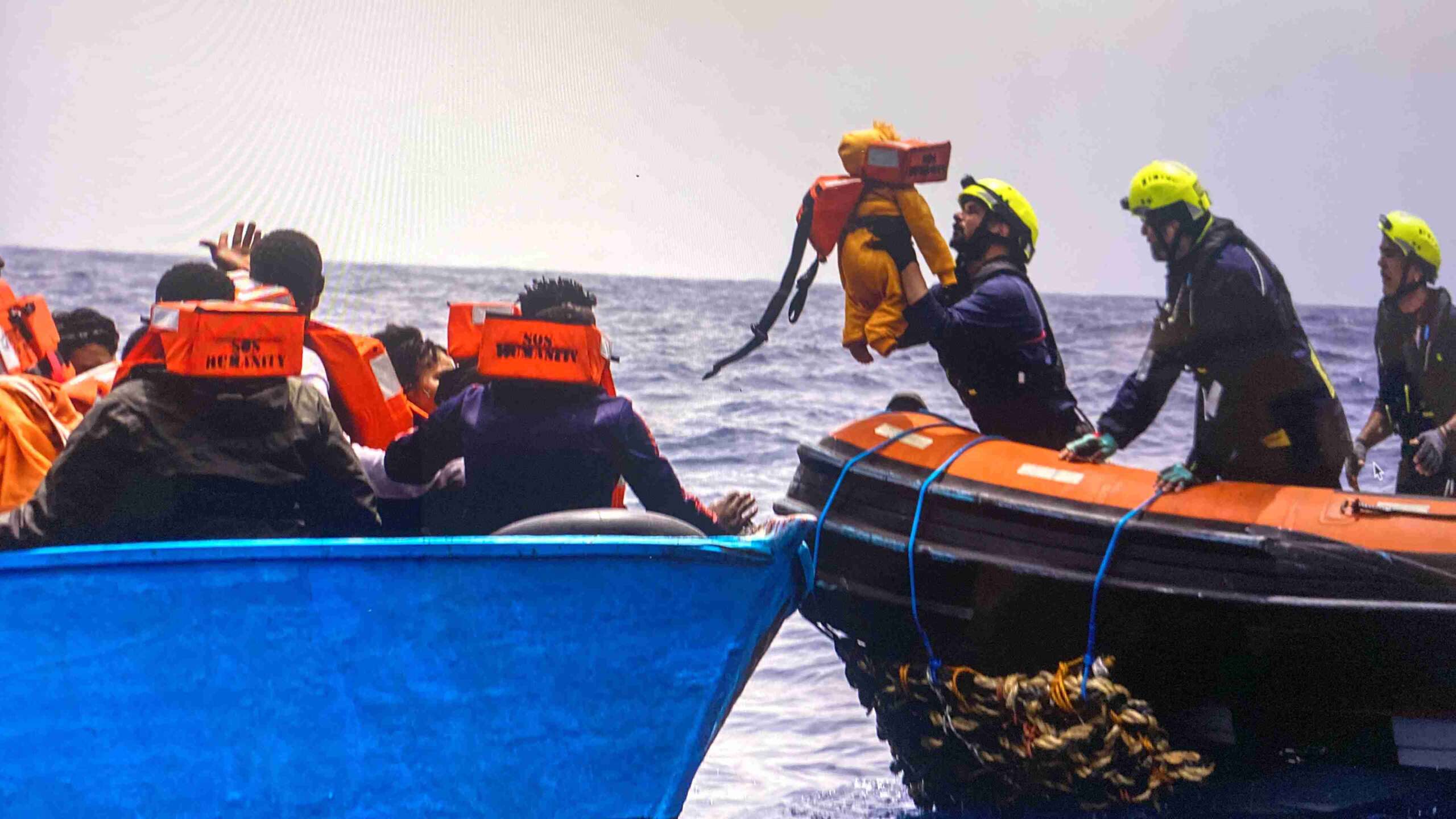 Sono 42 persone, 22 minori, 19 dei quali viaggiano da soli. In mare da tre giorni, questa è la seconda notte alla deriva. Il motore s’è rotto. La linea di galleggiamento a poppa è molto bassa, soffia vento forte, entrano ondate di acqua salata. Sono storditi dalle esalazioni di carburante. Hanno tutti freddo, sono disidratati, fradici. Uno per uno vengono issati a bordo.