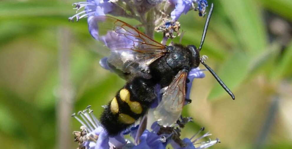 La ‘Megascolia maculata‘, meglio conosciuta come vespa mammut, è la vespa parassitoide più grande d’Europa. La femmina, esemplare di dimensioni maggiori rispetto al maschio, può raggiungere i 4 centimetri di lunghezza. Nonostante la ‘stazza’ non è un insetto aggressivo. La sua principale caratteristica è quello dell’impollinatore. Questa vespa si ‘fa viva’ nei periodi caldi dell’anno, di solito da maggio a settembre.