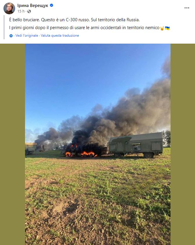 “Brucia magnificamente, è un S-300, sul territorio russo nei primi giorni dopo il permesso di usare armi occidentali sul territorio nemico”, ha postato su Facebook Vereshchuk insieme a una foto in cui mostra l’attacco, non specificando in realtà se le armi utilizzate nell’attacco fossero state fornite dagli Stati Uniti.
