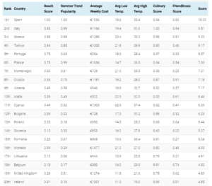Ecco le prime 10 destinazioni estive europee e i loro punteggi: