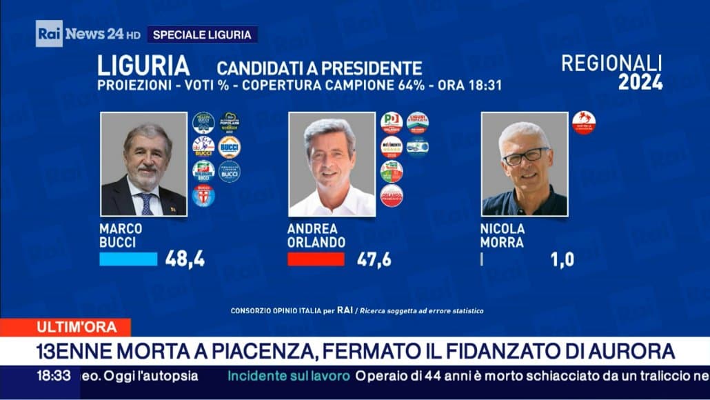 Si sarebbe ancora assottigliato invece il vantaggio di Marco Bucci nella corsa per la presidenza della Regione Liguria. Secondo quanto emerge dalla quinta proiezione elaborata dal Consorzio Opinio Italia per Rai, con una copertura campione del 64%, Bucci avrebbe ottenuto il 48,4% delle preferenze mentre il suo avversario, il candidato del centrosinistra Andrea Orlando, sarebbe al 47,6%.