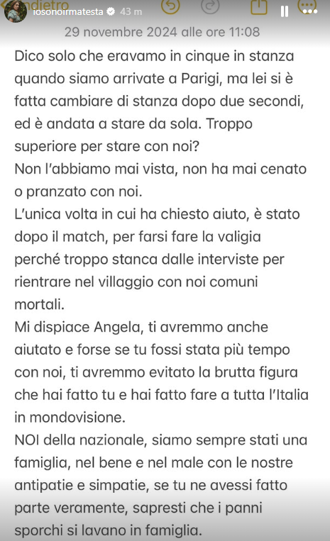 “Dico solo che eravamo in cinque in stanza quando siamo arrivate a Parigi, ma lei si è fatta cambiare di stanza dopo due secondo ed è andata a stare da sola. Troppo superiore per stare con noi? Non l’abbiamo mai vista, non ha mai cenato o pranzato con noi. L’unica volta in cui ha chiesto aiuto, è stato dopo il match, per farsi fare la valigia perché troppo stanca dalle interviste per rientrare nel villaggio con noi comuni mortali. Mi dispiace Angela, ti avremmo anche aiutato e forse se tu fossi stata più tempo con noi, ti avremmo evitato la brutta figura che hai fatto tu e hai fatto fare a tutta l’Italia in mondovisione. NOI della Nazionale, siamo sempre stati una famiglia, nel bene e nel male con le nostre antipatie e simpatie, se tu ne avessi fatto parte veramente, sapreste che i panni sporchi si lavano in famiglia”.