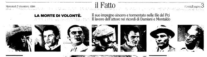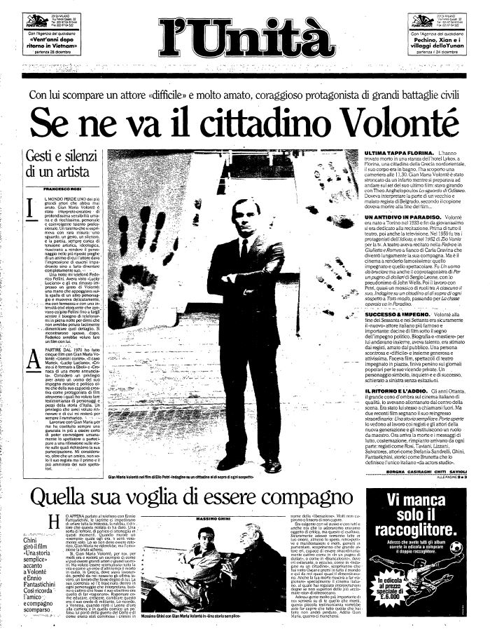 In quelle pagine de L’Unità le voci di colleghi e registi come Giuliano Montaldo e Damiano Damiani che raccontavano l’attore sul set e nella preparazione, nella fase di studio; il ricordo di Oreste Scalzone, leader di Autonomia Operaia, in cui raccontava come Volonté lo aiutò a fuggire in Francia sulla sua barca a vela; un ricordo di Massimo Ghini; le voci di Velletri dove Volonté si era trasferito; un testo dello stesso Volonté pubblicato su Nuova Generazione in cui parlava del neorealismo come “non certo funzionale alla DC mangia comunisti né ai nostri protettori americani, né tanto meno alla rinascente industria cinematografica completamente asservita alla classe dominante”.