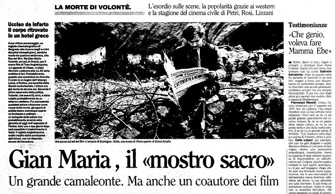 Con Gian Maria Volontè se ne andava “un attore difficile e molto amato, coraggioso protagonista di grandi battaglie civili”. Era il 7 dicembre del 1994 e L’Unità apriva la sua pagina di cultura con l’ultimo saluto all’attore eclettico e impegnato, senza timore di esagerare definito un mostro sacro del cinema, molto prolifico anche a teatro e in televisione. “Il mondo perde uno dei più grandi attori che abbia mai avuto”, scriveva in un editoriale il regista Francesco Rosi. Per Gabriele Salvatores “cambiava sempre ma era sempre riconoscibile”.