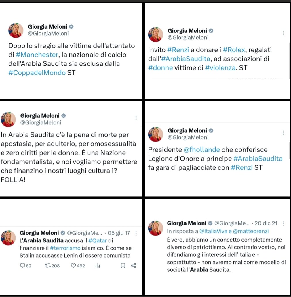 Il faccia a faccia con bin Salman sotto la tenda di Al-Ula e gli accordi col Paese arabo e la promessa di nuovi grossi affari bastano alla premier per dimenticare il passato anche piuttosto recente in cui, dai banchi dell’opposizione, non aveva timore ad attaccare l’Arabia Saudita, descritto come un “regime fondamentalista”.