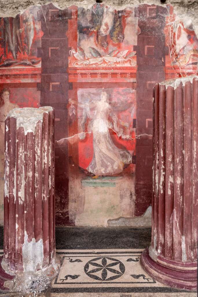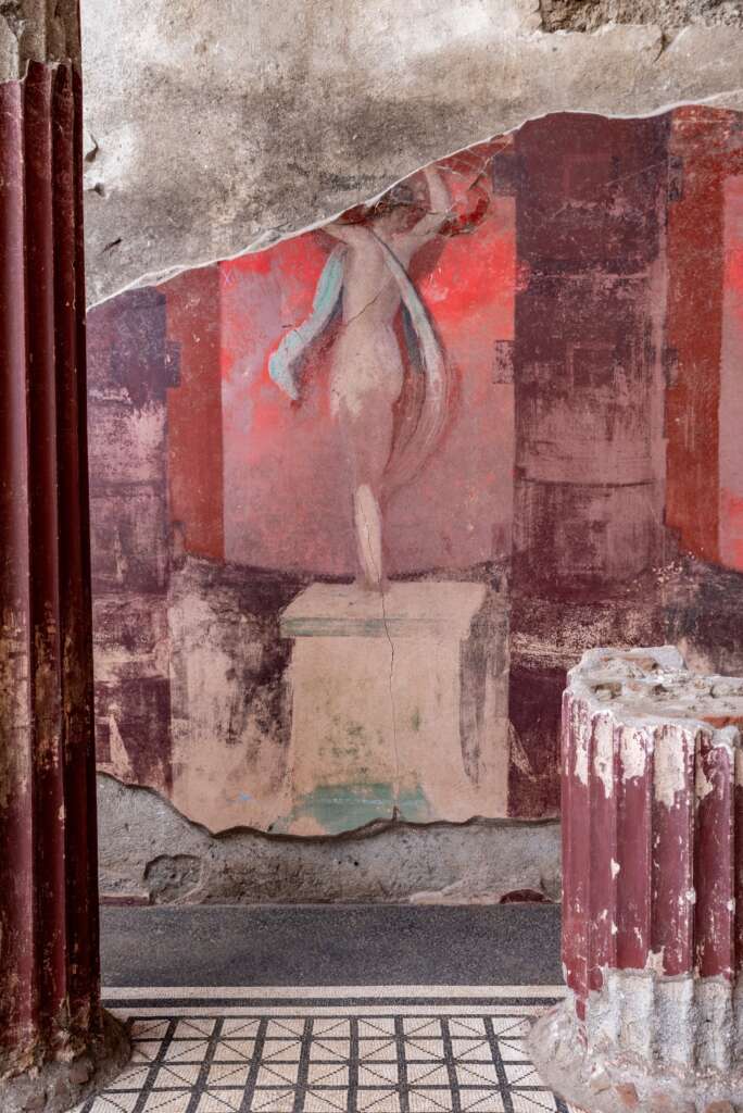 Un dettaglio curioso consiste nel fatto che tutte le figure del fregio sono rappresentate su piedistalli, come se fossero delle statue, mentre al tempo stesso movimenti, carnagione e vestiti le fanno apparire molto vive. Gli archeologi hanno battezzato la dimora con il fregio “casa del Tiaso”, con riferimento al corteo di Dioniso. Nell’antichità esistevano una serie di culti, tra cui quello di Dioniso, che erano accessibili solo a chi compiva un rituale di iniziazione, come suggerito nel fregio di Pompei. Tali culti si chiamavano “misterici”, perché solo gli iniziati potevano conoscerne i segreti. Spesso erano legati alla promessa di una nuova vita beata, sia in questo mondo sia in quello dell’oltretomba. Il fregio scoperto a Pompei è attribuibile al II Stile della pittura pompeiana, che risale al I sec. a.C. Più precisamente, il fregio può essere datato agli anni 40-30 a.C. Questo significa che nel momento dell’eruzione del Vesuvio, che seppellì Pompei nel 79 d.C. sotto lapilli e ceneri, il fregio dionisiaco era già vecchio di circa un secolo.