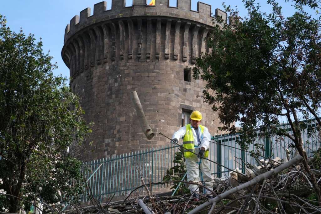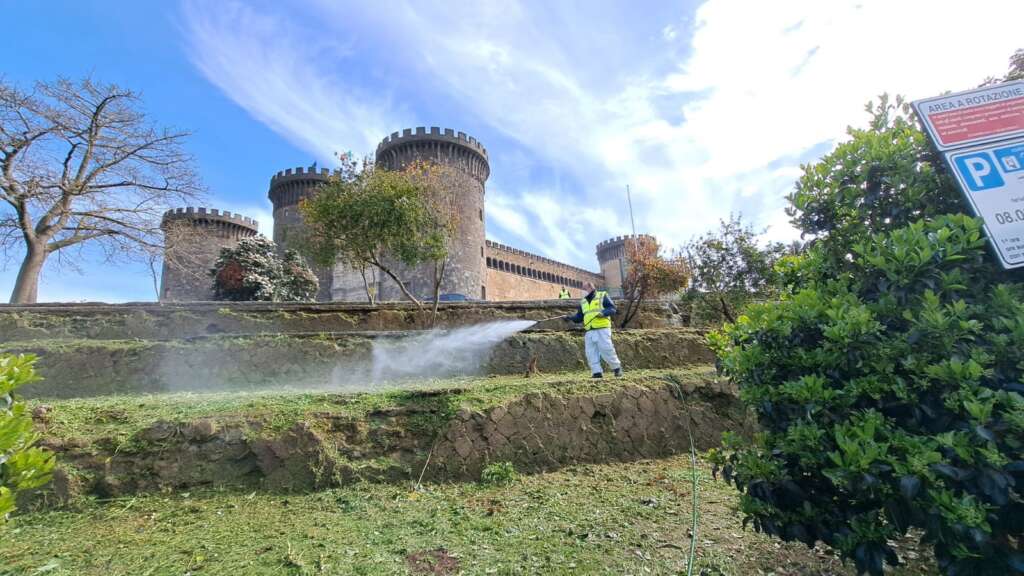 Oltre venti persone tra operai, tecnici, assistenti sociali e agenti della Polizia locale sono state impegnate, dall’alba di oggi, in un complesso intervento nell’area degli spalti del Maschio Angioino che ha restituito ai cittadini e ai turisti un importante spazio verde: un’area di circa 500 metri quadrati, ai piedi di uno dei più prestigiosi monumenti cittadini, da tempo occupata da persone senza fissa dimora e da cumuli di rifiuti di ogni genere. L’operazione ha visto impegnato personale di Napoli Servizi, Asia, Anm, Servizi Sociali del Comune, Nucleo investigativo Ambientale Emergenze Sociali della Polizia locale e Servizio Veterinario dell’Asl.