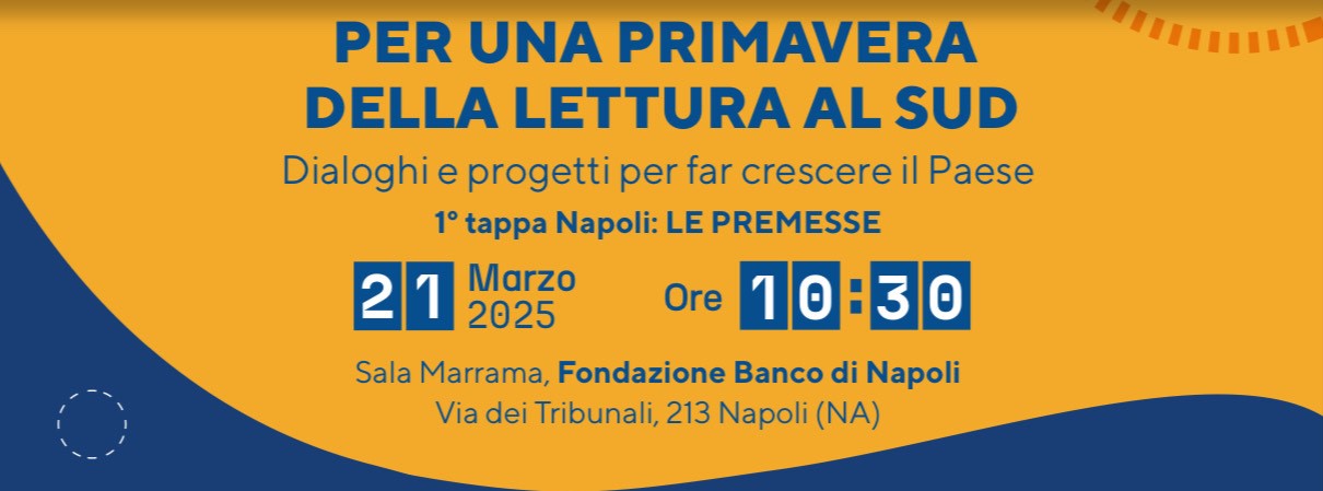 L’Associazione Italiana Editori invita istituzioni, esperti della lettura, operatori culturali, docenti, l’intero mondo del libro a partecipare il 21 marzo all’incontro ‘Per una primavera della lettura al Sud – Dialoghi e progetti per far crescere il Paese‘, che si terrà a partire dalle 10.30 nella sede della Fondazione Banco di Napoli, in Via dei Tribunali 213. Dopo i saluti istituzionali del presidente di AIE Innocenzo Cipolletta, del ministro della Cultura Alessandro Giuli e del Soprintendente archivistico e bibliografico della Campania Gabriele Capone, il responsabile dell’ufficio studi di AIE Giovanni Peresson illustrerà i risultati dell’indagine ‘Lettura, lettori, consumi culturali e infrastrutture per la lettura nelle regioni del Sud‘.