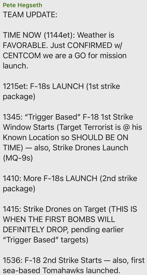 Sono infatti le 11:44 di quel 15 marzo quando Hegseth scrive: “Confermo che CENTCOM (il comando centrale degli Stati Uniti per il Medio Oriente, ndr) dà il GO (il via libera, ndr) alla missione di lancio”, per poi aggiungere che alle “Ore 12:15: lancio degli F18” e che alle 13:45 è previsto un lancio di droni con “obiettivo: un terrorista nella nota posizione”.
