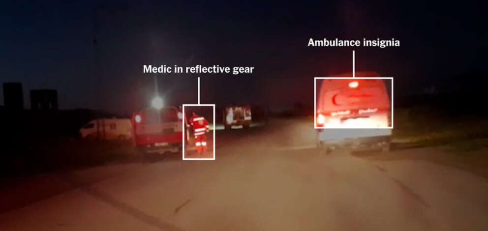 Parole che vengono smentite dal video del New York Times. Il filmato, girato dall’interno di una delle auto poi prese di mira e presentato dalla Mezzaluna Rossa Palestinese in una conferenza stampa alle Nazioni Unite, mostra chiaramente come il convoglio con ambulanze e mezzi dei vigili del fuoco palestinesi erano contrassegnati e avevano le luci di emergenza accese.