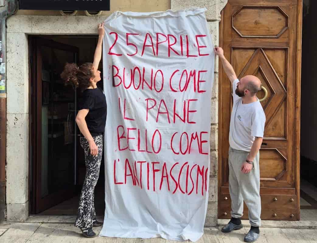 Ancora non è finito il 25 aprile con il caso della fornaia di Ascoli Piceno che si ingrandisce e assume forme grottesche e minacciose. All’identificazione per uno striscione e alla solidarietà politica si aggiungono infatti degli striscioni dai toni non proprio confortati. “25 Aprile, buono come il pane bello come l’antifascismo”, lo striscione che Lorenza Roiati aveva esposto davanti alla sua attività, L’assalto ai forni, in occasione dell’80esimo anniversario della festa della Liberazione. Quello che il governo aveva invitato a celebrare con sobrietà. La panificatrice era stata visitata e identificata due volte dalle forze dell’ordine per quel lenzuolo esposto.