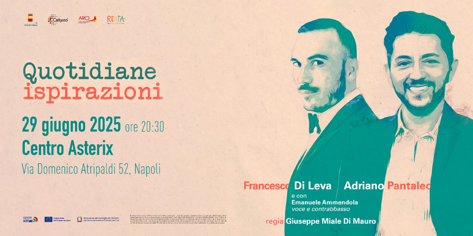 Nell’ambito del progetto R.E.S.T.A – Rigenerazione Economica Sociale Territoriale Attiva, promosso dal Comune di Napoli all’interno del Piano Integrato Urbano per la riqualificazione dell’insediamento di Taverna del Ferro, si terrà domenica 29 giugno alle ore 20:30 presso il Centro Asterix lo spettacolo “Quotidiane ispirazioni”. Realizzato con la regia di Giuseppe Miale Di Mauro, lo spettacolo vede in scena Francesco Di Leva e Adriano Pantaleo, accompagnati dal contrabbasso e dalla voce di Emanuele Ammendola. Un recital contemporaneo che intreccia poesia, musica e memoria collettiva, mettendo al centro l’eredità culturale di Napoli come fonte di ispirazione quotidiana.