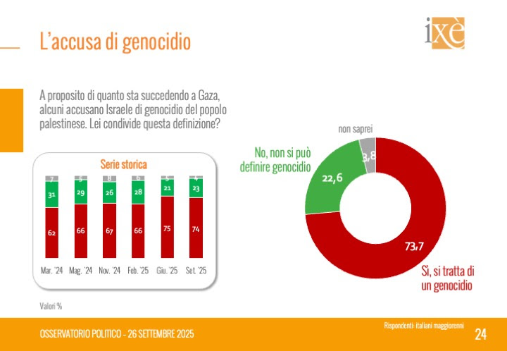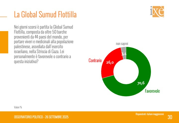Per tre italiani su quattro non c’è dubbio: nella Striscia di Gaza si sta consumando un genocidio. E nonostante gli attacchi subiti nel porto a Tunisi e in acque internazionali, gli appelli del governo della premier Giorgia Meloni del Presidente della Repubblica Sergio Mattarella e le accuse dei filo-sionisti, gli italiani sono dalla parte della Global Sumud Flotilla. È quanto emerge dall’ultimo sondaggio Ixè che segnala un accenno di erosione nella fiducia nel governo Meloni e una generale disaffezione alle occasioni elettorali. La tornata ai seggi di questo week end potrebbe comunque chiarire ulteriormente la situazione.