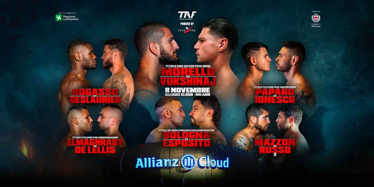 Edoardo Germani, Founder di TAF, dichiara: “Abbiamo vinto l’asta dell’incontro di Dario Morello per il titolo EBU Silver“, l’ex Unione Europea, tappa obbligata verso la corona continentale (il prestigioso EBU Gold), “una prova di maturità a livello manageriale. A quel punto era impossibile rinunciare all’Allianz: il pubblico è sempre più appassionato e ci sta premiando, scalpita per sostenere un italiano pronto a conquistarsi una fetta d’Europa”. Ed è proprio nel main event della serata che Dario Morello (25-1) affronterà lo svizzero Faton Vukshinaj (17-1, 2 pareggi) per il titolo EBU Silver dei pesi medi. Vukshinaj è un pugile pericoloso: 70% di vittorie per KO e potenza da categoria superiore. Morello si presenta all’incontro dopo aver sbaragliato la concorrenza nazionale ed essersi messo in bacheca il titolo italiano e altre quattro cinture internazionali.