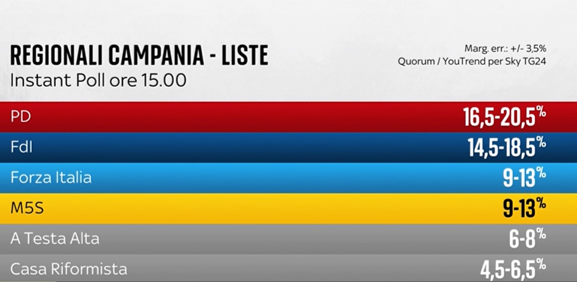 Ore 17:50 – Guidano le liste delle regionali in Campania il Partito Democratico, al 18%, e Forza Italia, al 12,5%. Appena il nove e mezzo percento al Movimento 5 Stelle. La lista del governatore uscente, De Luca, al 7,4%.