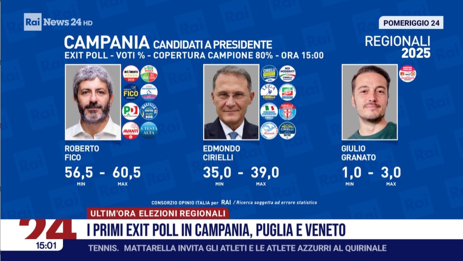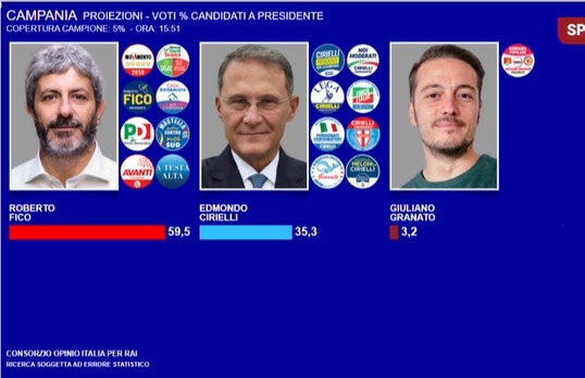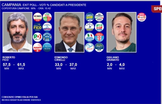 Ore 15:05 – Anche secondo Opinio Rai Roberto Fico è in netto vantaggio, a una percentuale tra 56,5-60,5%. Cirielli al 35% circa.