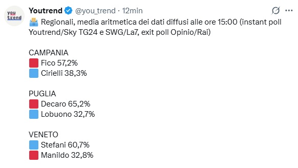 Ore 15:30 – Una media aritmetica dei dati delle 15:00 tra gli instant poll di YouTrend, SWG e Opinio calcola Fico al 57,2%, Cirielli al 38,3%.
