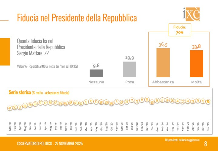 In questo quadro il Partito Democratico è al 21,8%, l’Alleanza Verdi e Sinistra al 7,1%, Azione di Carlo Calenda al 3%, Italia Viva di Matteo Renzi al 2,6%. A una generica voce “altri” va un altro 2,5%. Il dato che resta sempre piuttosto egemone è quello che riguarda la partecipazione, con soltanto un 47,2% orientato al voto. Scende leggermente intanto la fiducia nel Presidente della Repubblica Sergio Mattarella, al 70%, dal 73% dello scorso settembre, mai così in basso dal 69% del dicembre 2023. Stabile invece la fiducia nel governo di centrodestra presieduto dalla premier Giorgia Meloni, al 37%.
