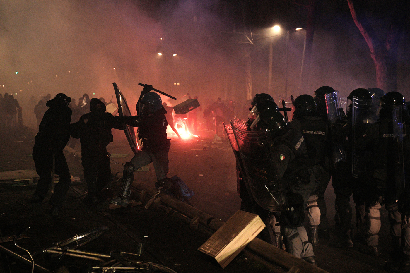 Da lì sono iniziati violenti scontri: la polizia ha risposto con idranti, lacrimogeni e cariche, i manifestanti incappucciati hanno dato fuoco ad alcuni cassonetti dell’immondizia e a un mezzo blindato della polizia, lanciando sedie e tavoli di bar e ristoranti chiusi contro le forze dell’ordine.