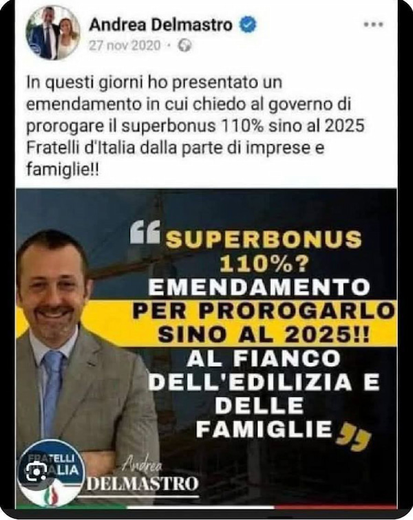 Eppure tornando indietro nel tempo Fratelli d’Italia era tutt’altro che ostile al provvedimento ora utilizzato come misura responsabile dei problemi alle finanze pubbliche del Paese. Come scrive Domani, il 27 novembre 2020 Andrea Delmastro, all’epoca deputato di Fratelli d’Italia all’opposizione del governo Conte, rivendicava addirittura di aver presentato un emendamento per chiedere all’esecutivo di “prorogare il Superbonus 110 per cento sino al 2025. Fratelli d’Italia dalla parte di imprese e famiglie!”, scriveva Delmastro, con l’ex sottosegretario alla Giustizia del governo Meloni che pubblicava il tutto in un post sui social con tanto di foto personale.