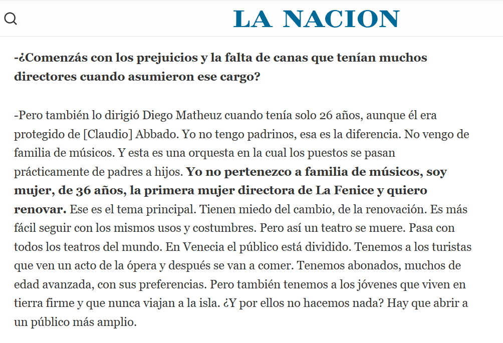 A ottobre avrebbe dovuto assumere la direzione musicale, la nomina era stata giudicata inadeguata, per qualità ed esperienza, da orchestrali e sindacati. Il sovrintendente Nicola Colabianchi, lo stesso che con una nota ufficiale ha troncato ogni collaborazione, l’aveva sempre difesa fino alle dichiarazioni fatali rilasciate a La Nacion. “Io non ho padrini – aveva dichiarato Venezi nell’intervista al quotidiano argentino – questa è la differenza. Non provengo da una famiglia di musicisti. E questa è un’orchestra dove le posizioni si tramandano praticamente di padre in figlio. Non provengo da una famiglia di musicisti, sono una donna, ho 36 anni, sono la prima direttrice d’orchestra del Teatro La Fenice, e voglio portare un cambiamento. Questo è il punto principale. Hanno paura del cambiamento, del rinnovamento. È più facile rimanere ancorati alle vecchie abitudini. Ma è così che muore un teatro. Succede a tutti i teatri del mondo. A Venezia il pubblico è diviso”.